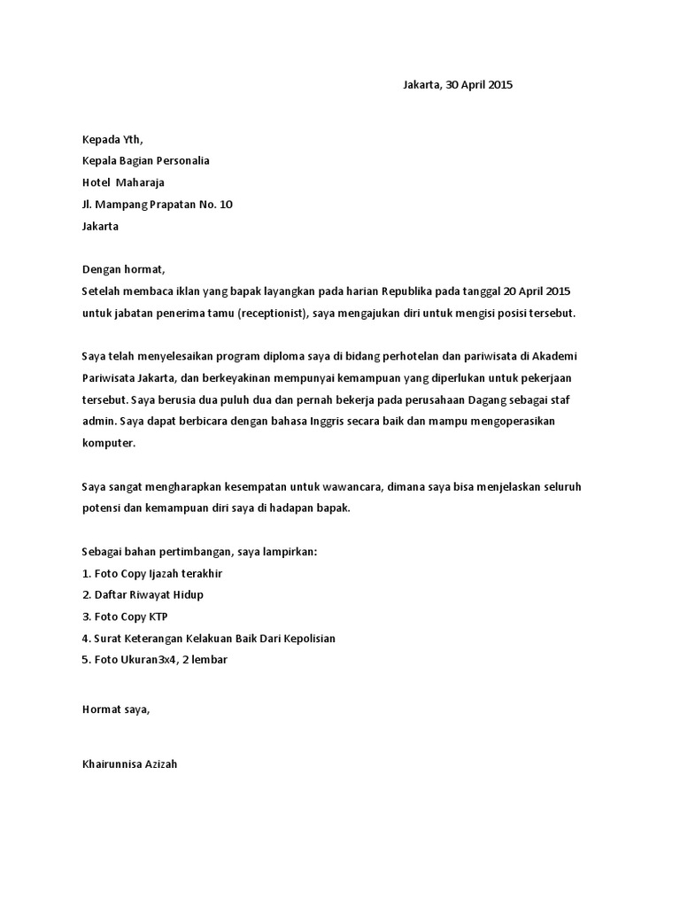 Pengertian surat lamaran pekerjaan adalah jenis surat pribadi bersifat resmi yang diajukan seseorang ke perusahaan (instansi) agar diterima bekerja. Contoh surat surat lamaran kerja di hotel posisi cleaning service. Bca sedang membutuhkan pekerja tambahan pada bagian teller. Simak contoh surat lamaran kerja terbaru berikut ini. Surat lamaran kerja adalah surat yang menunjukan minat seorang pelamar kerja. Contoh surat lamaran kerja di hotel untuk berbagai keperluan seperti untuk posisi pekerjaan cs dan untuk resepsionis serta lowongan lain. Ingin melamar pekerjaan di tahun 2020 ini? Berikut di bawah ini adalah beberapa contoh surat lamaran kerja di hotel yang bisa anda pergunakan sebagai bahan referensi untuk menulis contoh surat. Dijamin lolos seleksi hrd, begini contoh surat lamaran kerja yang benar. Contoh surat lamaran kerja hotel. Jika anda ingin melamar pekerjaan sebagai resepsionis di hotel, anda bisa mendownload contoh surat lamaran kerja di hotel dibawah ini. Adapun format umum surat lamaran pekerjaan yang ditujukan ke hotel tetap berdasarkan kaidah penulisan surat secara baik dan benar. Jumlah para pencari kerja yang banyak dengan.